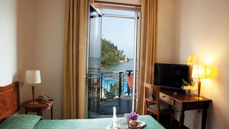 Das Hotel serviert ein leckeres Frühstücksbuffet auf dem Gemeinschaftsbalkon mit Seeblick. Starten Sie Ihren Tag mit einer Auswahl an köstlichen Speisen und genießen Sie dabei die wunderschöne Aussicht auf den Gardasee.