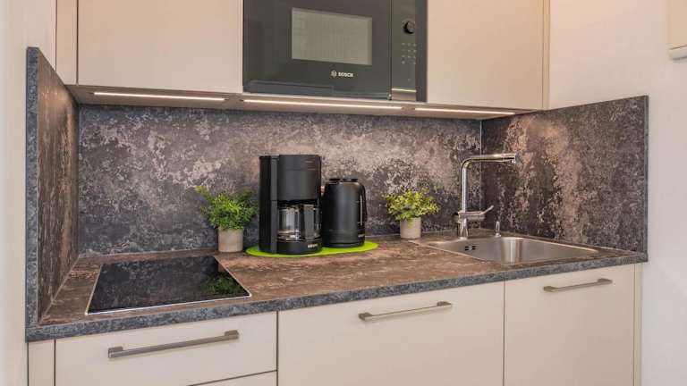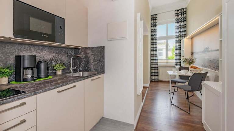 Die Ferienwohnung in der Villa Carmen Seebrücke verfügt über einen Flachbild-TV und eine Küchenzeile, die mit einem Kühlschrank, Toaster, Kaffeemaschine und Wasserkocher ausgestattet ist.