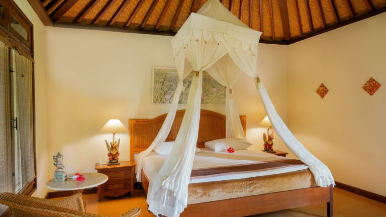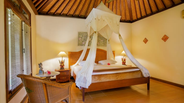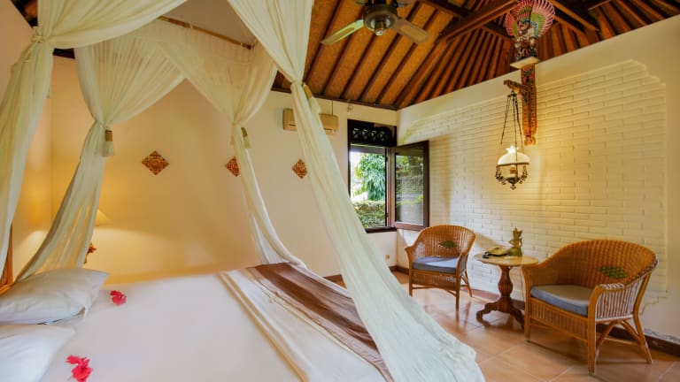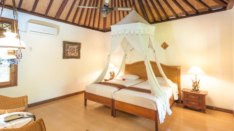 Die geräumigen Cottages der Villa Chempaka sind im traditionellen balinesischen Stil eingerichtet und bieten den Gästen eine komfortable Unterkunft. Jedes Cottage ist mit einem großen Deckenventilator, einer Klimaanlage und einer Minibar ausgestattet. Das private Badezimmer verfügt über eine Warm-/Kaltwasserdusche. Genießen Sie Ihren Aufenthalt in den authentischen balinesischen Cottages und lassen Sie sich von der traditionellen Atmosphäre verzaubern.