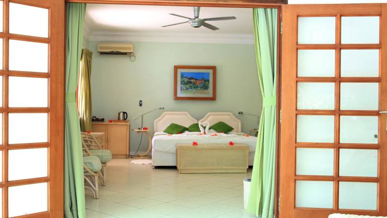Die Villa de Cerf auf der Insel Cerf ist ein tropisches Paradies an der Nordküste von Mahé. Hier können Sie in luxuriösen Zimmern mit Pool- und Meerblick entspannen und den Außenpool und die Sonnenterrasse genießen. Das Hotel bietet auch ein Restaurant, eine Gemeinschaftslounge und ein Spielezimmer für Unterhaltungsmöglichkeiten. Die Umgebung bietet zahlreiche Aktivitäten wie Wandern, Wasserparks und Tauchen. WLAN nutzen Sie kostenfrei.
