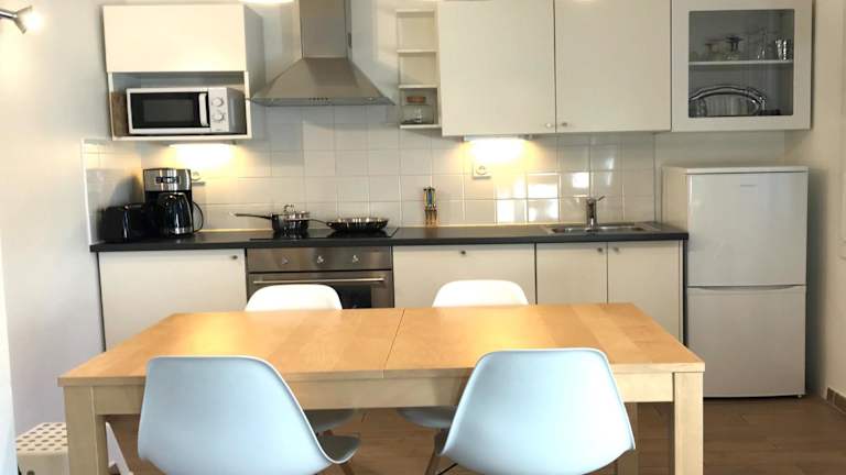 Die Ferienwohnung umfasst zwei Schlafzimmer, ein Wohnzimmer sowie eine gut ausgestattete Küche mit Kühlschrank und Geschirrspüler. Des Weiteren stehen ein Flachbild-TV und ein Badezimmer mit Dusche zur Verfügung. Handtücher und Bettwäsche sind im Preis enthalten. Die Terrasse bietet einen Meerblick. Ein Kinderspielplatz ist ebenfalls vorhanden.