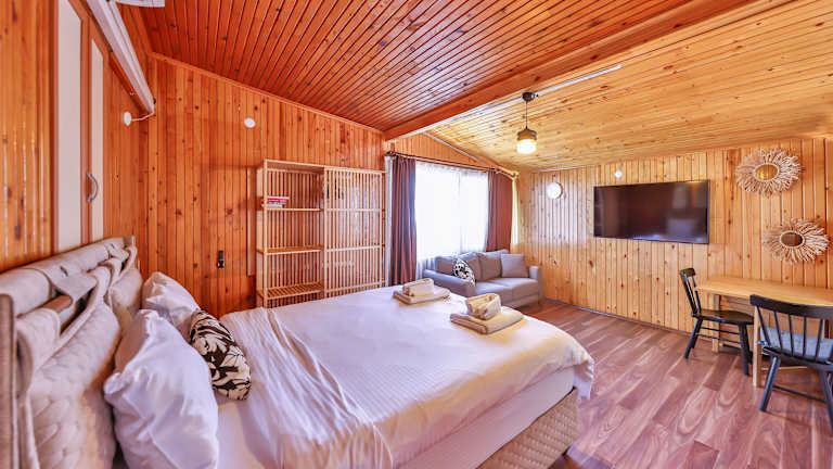 Die Unterkünfte sind mit Parkettböden ausgestattet und verfügen über einen Satelliten-Flachbild-TV, eine voll ausgestattete Küche mit Kühlschrank und ein eigenes Badezimmer mit Dusche, Haartrockner und Bidet.