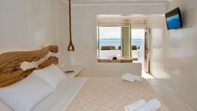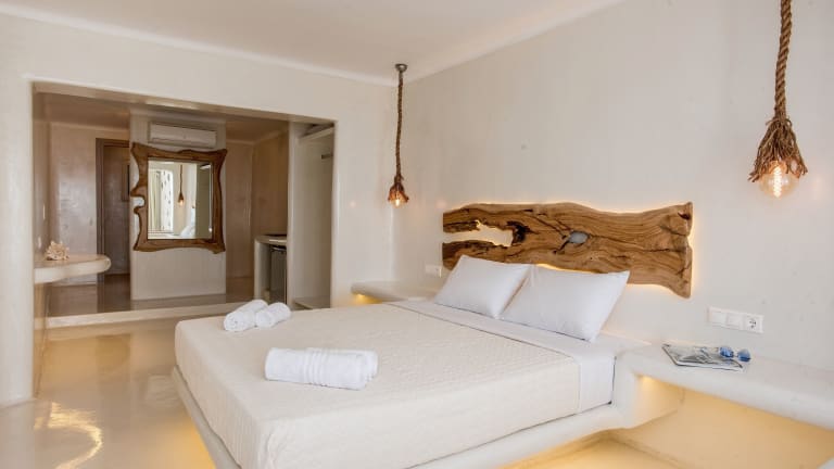 Die Suiten in der Villa Elina sind elegant und im typischen Mykonos-Stil eingerichtet. Sie bieten eine komfortable und stilvolle Unterkunft für Ihren Aufenthalt. Die Zimmer verfügen über eingebaute Betten, Holzspiegel, Klimaanlage, Flachbild-TV und Kühlschrank. Die Badezimmer sind modern und mit ebenerdigen Duschen ausgestattet. Einige Suiten haben einen Balkon oder eine Terrasse, wo Sie die Sonne und die frische Luft genießen können. Für zusätzlichen Luxus gibt es sogar Suiten mit einem Whirlpool.