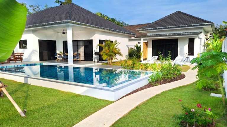 Die Unterkunft Villa et Bungalow Baan Joan Khao Lak bietet einen Poolblick und umfasst verschiedene Annehmlichkeiten, darunter einen eigenen Pool, einen Garten sowie kostenlose Parkmöglichkeiten. Die Villa ist klimatisiert und besteht aus 3 Schlafzimmern, einem Wohnzimmer und einer voll ausgestatteten Küche. Es sind auch mehrere Badezimmer vorhanden.