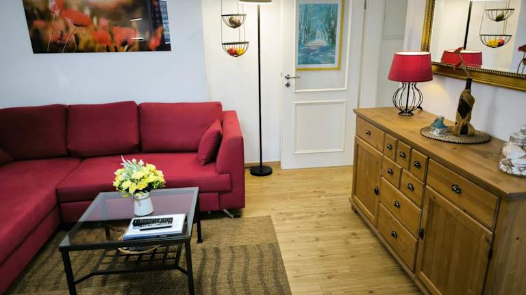 Die Wohnung umfasst ein Schlafzimmer und ein Wohnzimmer. Eine voll ausgestattete Küche mit Kühlschrank und Kaffeemaschine sowie ein Badezimmer mit Dusche sind ebenfalls vorhanden. Zur Unterhaltung steht ein Fernseher zur Verfügung. Die Unterkunft ist eine Nichtraucherunterkunft, und sowohl öffentliche als auch private Bereiche sindrauchfrei.