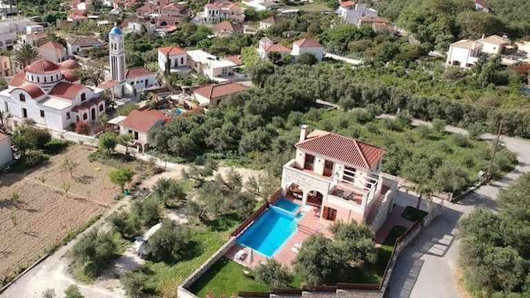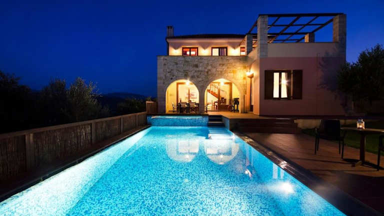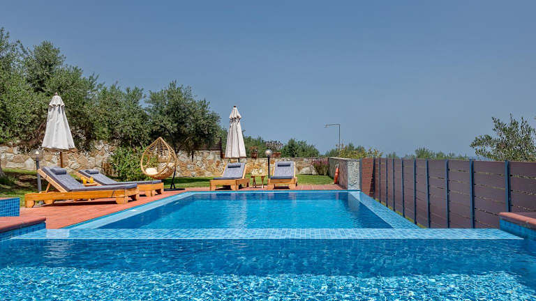 Die Villa Katerina with Eco heated pool bietet eine komfortable Unterkunft für bis zu 6 Personen. Im Erdgeschoss befindet sich ein offenes Wohnzimmer mit einem gemütlichen Kamin und einem Essbereich mit Blick auf den Pool und den Olivenhain. Eine voll ausgestattete Küche und ein Zweibettzimmer mit eigenem Bad und Hydromassage-Dusche sind ebenfalls vorhanden. Auf der oberen Etage befindet sich ein weiteres Schlafzimmer mit Doppelbett und eigenem Bad mit Whirlpool-Badewanne. Dieses Schlafzimmer bietet auch Zugang zu einem Gemeinschaftsbalkon mit Meerblick. Ein drittes Schlafzimmer mit eigenem Bad und Hydromassage-Dusche ist ebenfalls vorhanden.