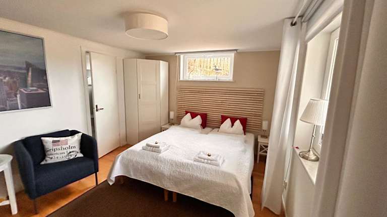 Das Apartment in der Villa Kulle verfügt über ein gemütliches Schlafzimmer und ein Badezimmer mit allen notwendigen Annehmlichkeiten wie Bettwäsche und Handtücher. Der Wohnbereich ist mit einem Flachbild-Sat-TV und einem Essbereich ausgestattet, wo Sie Ihre Mahlzeiten genießen können. Die voll ausgestattete Küche bietet Ihnen die Möglichkeit, Ihre eigenen Mahlzeiten zuzubereiten. Auf der Terrasse können Sie den Blick auf die Stadt genießen und die frische Luft genießen.