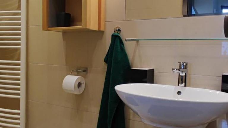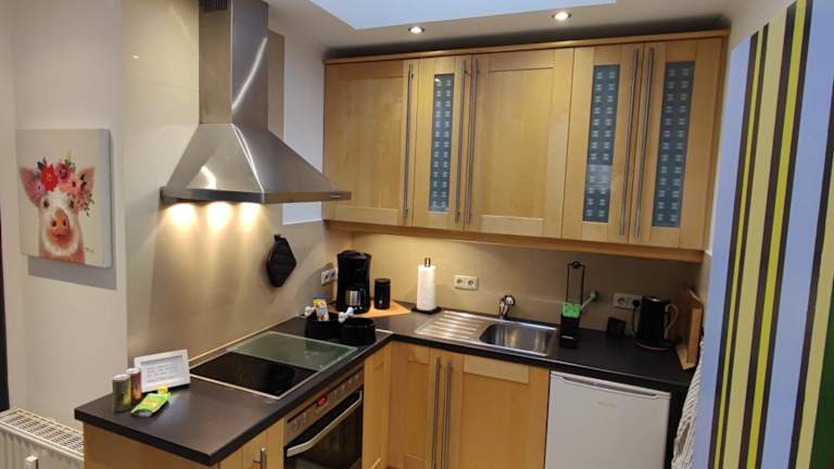 Die Ferienwohnung bietet Übernachtungsmöglichkeiten in einem Schlafzimmer und einem Wohnzimmer. Zur Ausstattung gehört eine voll ausgestattete Küche mit Kühlschrank und Kaffeemaschine. Das Badezimmer umfasst eine Dusche und einen Haartrockner. Handtücher und Bettwäsche werden bereitgestellt, und es gibt einen Flachbild-TV sowie kostenfreies WLAN.