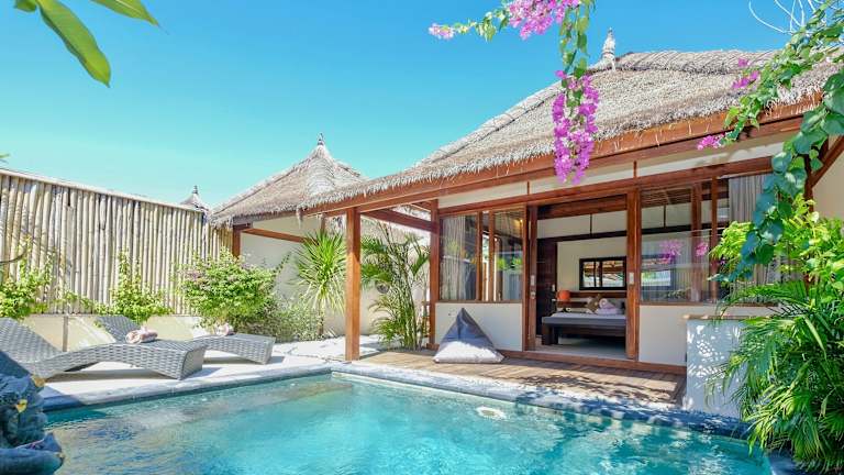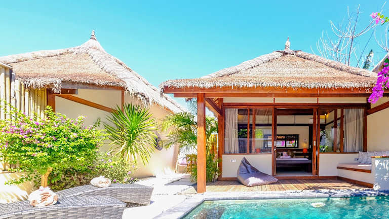 Die Villa Marina auf Gili Air bietet komfortable Unterkünfte mit eigenem Außenpool und kostenfreiem WLAN. Die Zimmer sind gemütlich eingerichtet und verfügen über eine Terrasse, einen Sitzbereich und einen Essbereich. Zur Ausstattung gehören auch eine Minibar und ein Wasserkocher. Entspannen Sie im Garten und genießen Sie ein erfrischendes Getränk an der Bar. Die Umgebung eignet sich perfekt zum Schnorcheln, Tauchen und Fahrradfahren.