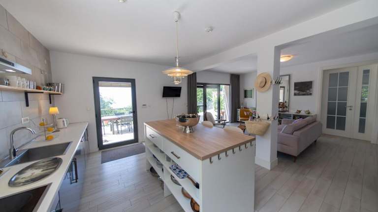 Die Villa bietet eine voll ausgestattete Küche, die mit einem Kühlschrank und einer Kaffeemaschine ausgestattet ist, um die Selbstversorgung zu ermöglichen.