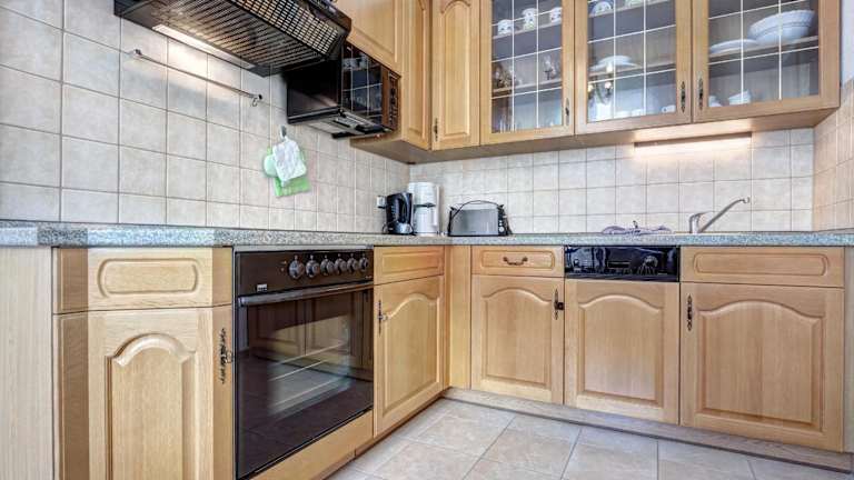 Die Ferienwohnung ist mit einer voll ausgestatteten Küche versehen, die über einen Kühlschrank, einen Geschirrspüler, einen Ofen und eine Kaffeemaschine verfügt. Es sind keine weiteren Informationen zu Verpflegungsmöglichkeiten vorhanden.