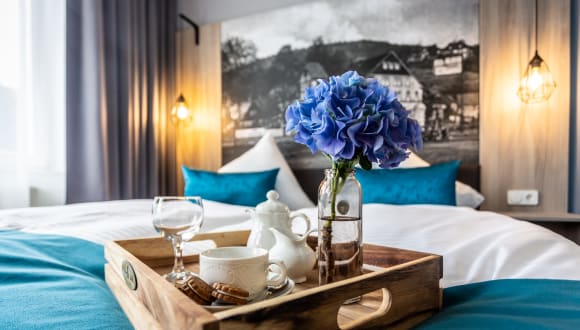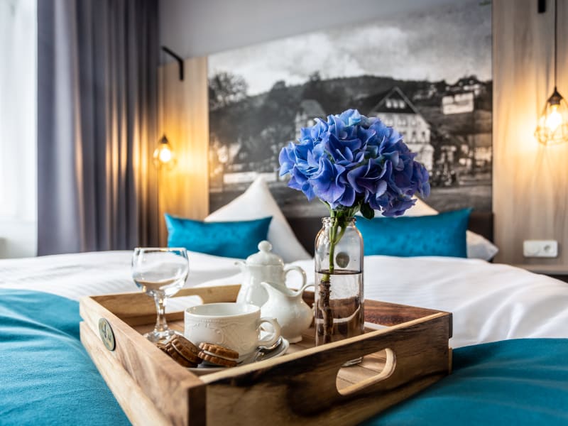 In den Zimmern des Sachsenhofes treffen moderne helle Möbelelemente auf einen Mix von Industrial- und Villastyle. Die Geschichte von Oberschlema, welches im Sachsenhof zentrales Thema ist und die Nähe zum Kurpark spiegeln ein ganz besonderes Flair wieder. Die typischen Elemente des Erzgebirges, Wasser, Stein und Holz wiederholen sich im Farbdesign und in der Ausstattung der Villa Sachsenhof. Petrol - Die Farbe der Industrialisierung, mit ihr werden im ganzen Haus Akzente gesetzt.