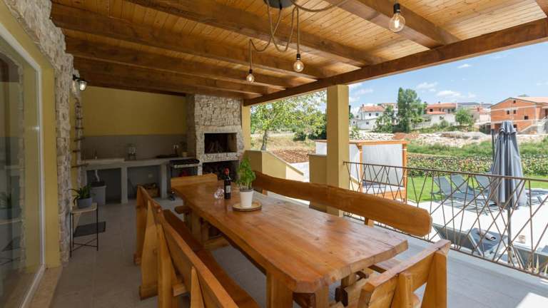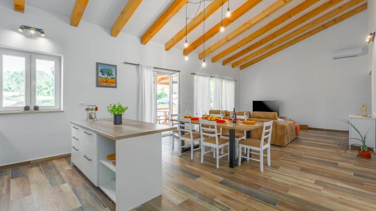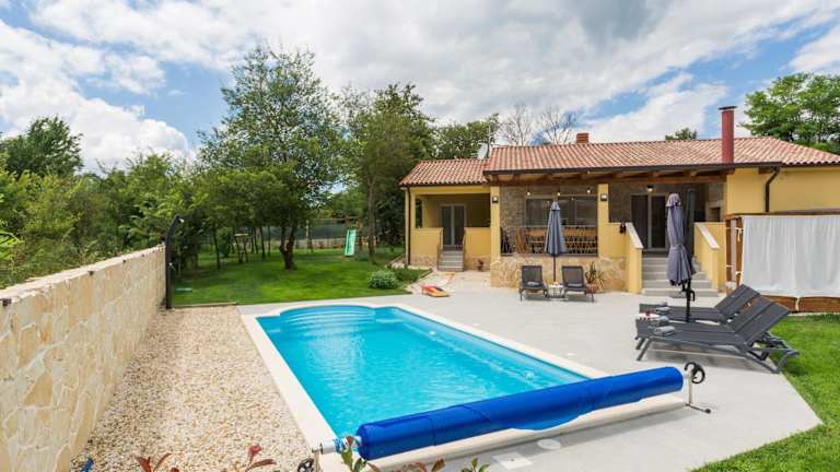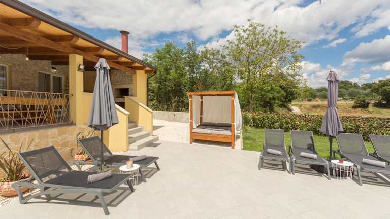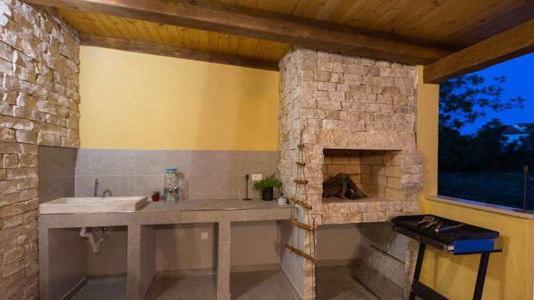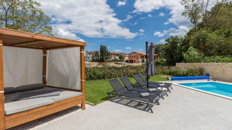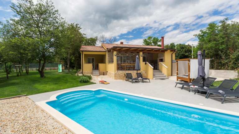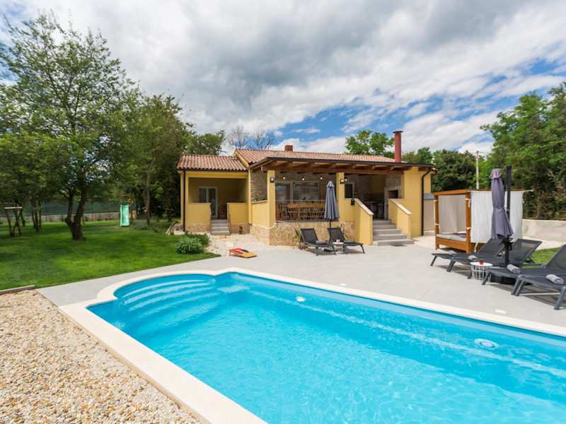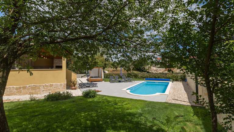 Die Villa verfügt über einen Außenpool, der ganzjährig genutzt werden kann, sowie Möglichkeiten zum Grillen im Garten. Sonnenschirme und Sonnenliegen stehen zur Verfügung, um den Aufenthalt im Freien zu genießen.