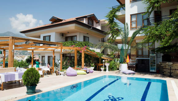 Die Villa Sonata in Alanya bietet Ihnen eine komfortable Unterkunft im Zentrum der Stadt mit herrlichem Panoramablick auf das Meer und die Stadt. Genießen Sie geräumige Apartments mit einer Küchenzeile und einem Balkon sowie einen Außenpool und ein Wellnesscenter. Das Hotel bietet auch ein Restaurant und verschiedene Wellnesseinrichtungen wie ein Türkisches Bad, einen Whirlpool und eine Sauna. Die Lage ist ideal, da sowohl die Höhle Damlataş als auch der Strand Kleopatra nur wenige Schritte entfernt sind.