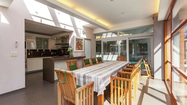 Die Villa beinhaltet vier Schlafzimmer und drei Badezimmer, die sowohl mit einer Dusche als auch einer Badewanne ausgestattet sind. Die Küche ist mit einem Kühlschrank, einem Geschirrspüler und einem Ofen eingerichtet. Das Wohnzimmer bietet einen Sitzbereich und einen Essbereich sowie einen Fernseher und einen DVD-Player.