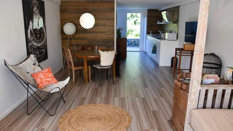Die Unterkunft bietet Übernachtungsmöglichkeiten in einem klimatisierten Ferienhaus, das aus 2 separaten Schlafzimmern, einem Wohnzimmer und einer voll ausgestatteten Küche mit Geschirrspüler und Ofen besteht. Ein Badezimmer und ein Flachbild-TV runden die Ausstattung ab.