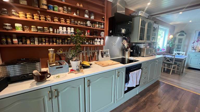 Die voll ausgestattete Küche umfasst einen Kühlschrank, einen Geschirrspüler, einen Ofen, eine Mikrowelle, eine Herdplatte sowie eine Kaffeemaschine und einen Wasserkocher, wodurch die Selbstverpflegung erleichtert wird.