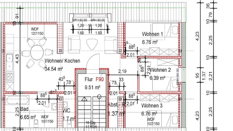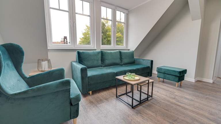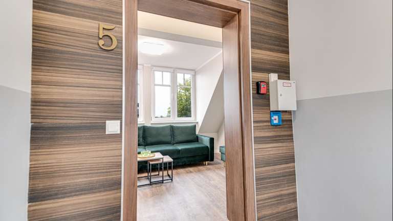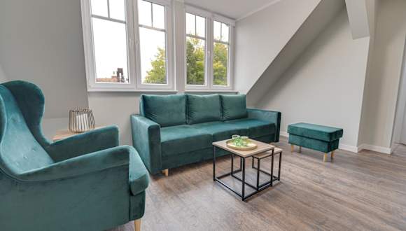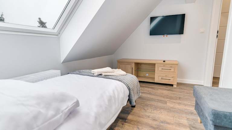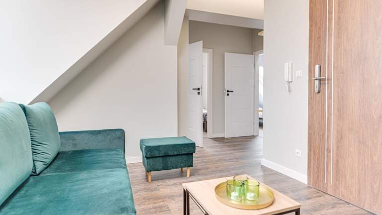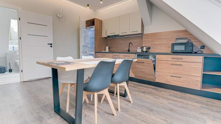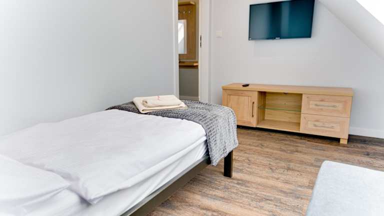 Die ApA 64 qm 4 Zimmer DG Wohnung bietet viel Platz und Komfort für Ihren Aufenthalt. Das Apartment verfügt über 3 Schlafzimmer, ein Wohnzimmer und eine voll ausgestattete Küche mit einem Kühlschrank und einem Wasserkocher. Das große Badezimmer ist mit einer Dusche ausgestattet. Handtücher und Bettwäsche werden gestellt, sodass Sie sich um nichts kümmern müssen.