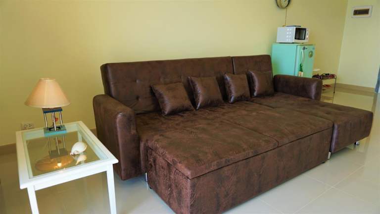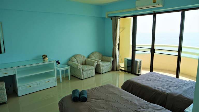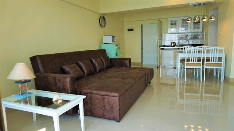 Das klimatisierte Apartment im VIP Condochain Rayong 410 verfügt über ein komfortables Schlafzimmer, einen separaten Wohn- und Küchenbereich sowie ein gut ausgestattetes Badezimmer. Für Unterhaltungsmöglichkeiten ist mit einem 40-Zoll-LED-TV und einem DVD-Player gesorgt. Ein gemütliches Schlafsofa mit zusätzlichen Decken und Kissen bietet zusätzlichen Komfort. Die Küchenzeile ist mit Küchenutensilien und einer Grundausstattung an Kochzubehör ausgestattet. Von den beiden Balkonen aus haben Sie eine atemberaubende 180-Grad-Aussicht auf das Meer.