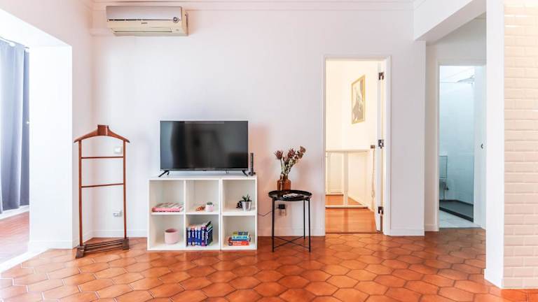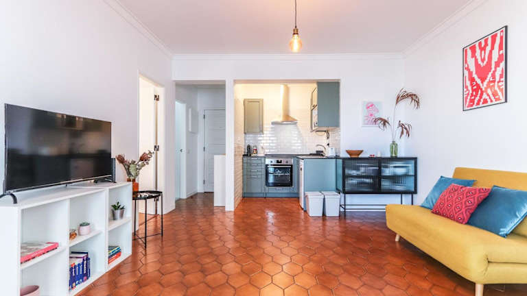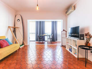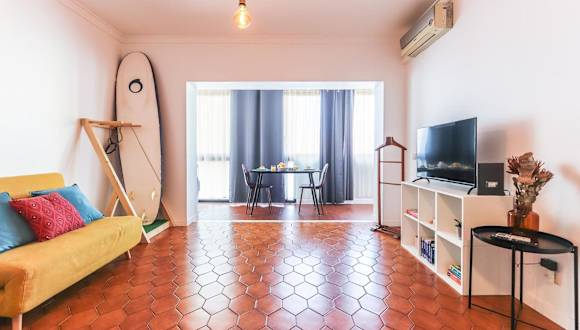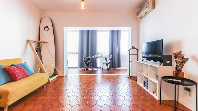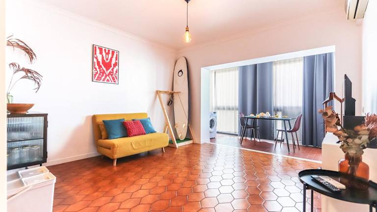 Vita Portucale! Surf Concept Costa Caparica bietet eine Ferienwohnung, die mit Klimaanlage ausgestattet ist. Die Unterkunft beinhaltet unter anderem ein Schlafzimmer, einen Flachbild-TV und eine Küche mit Kühlschrank sowie Geschirrspüler.