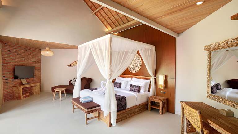 Die Zimmer sind mit Klimaanlage und Ventilator ausgestattet. Die meisten Zimmer verfügen über einen Balkon oder eine Terrasse. Zur weiteren Ausstattung gehören ein Queensize- oder Kingsize-Bett, ein Safe, eine Minibar, ein Schreibtisch sowie eine Kochnische mit Kühlschrank, Mikrowelle und Tee-/Kaffeezubereiter. Zudem stehen Fernseher mit Satelliten- oder Kabelempfang, kostenfreies WiFi, ein Haartrockner sowie Bademäntel zur Verfügung. Die Badezimmer sind mit Dusche und Badewanne ausgestattet.