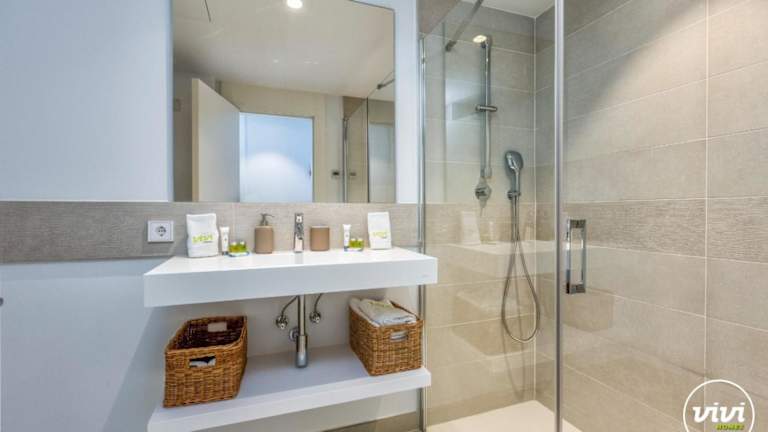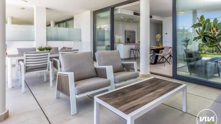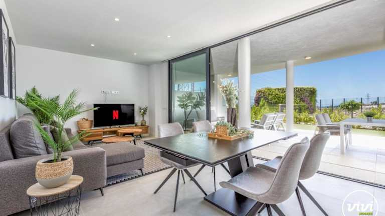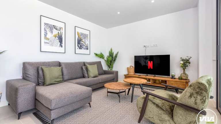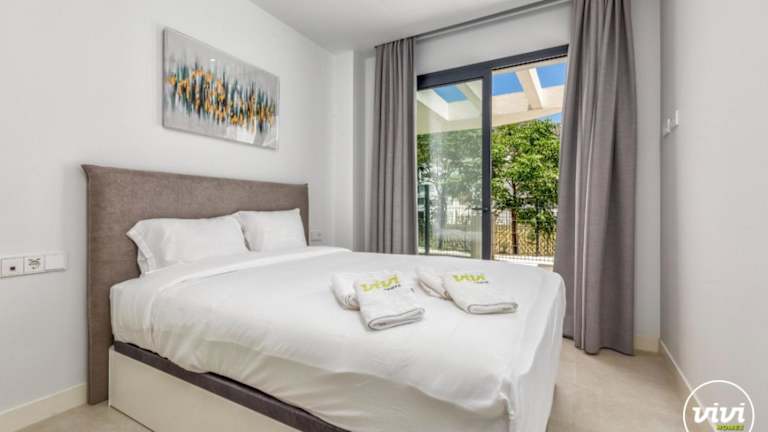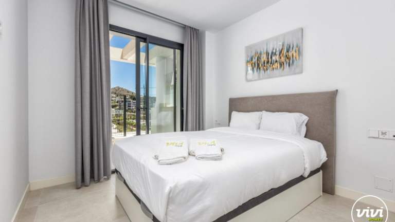 Die Ferienwohnung ist ausgestattet mit 2 Schlafzimmern, 2 Badezimmern und umfasst Annehmlichkeiten wie Bettwäsche, Handtücher, einen TV mit Kabelkanälen, einen Essbereich und eine Terrasse mit Blick auf den Pool.