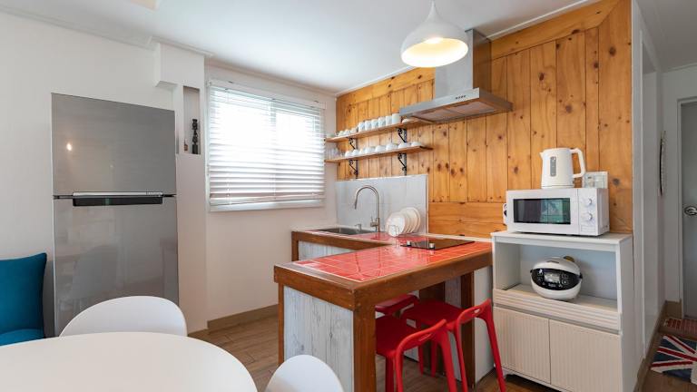 Die klimatisierten Unterkünfte in der Walking Sky Pension sind komfortabel und gut ausgestattet. Jede Wohneinheit verfügt über einen Balkon mit Bergblick, einen Flachbild-Sat-TV und einen Essbereich. Die Küche ist gut ausgestattet mit einem Kühlschrank, einer Mikrowelle, einem Kochfeld und einem Wasserkocher. Das eigene Badezimmer ist mit einer Dusche, kostenfreien Pflegeprodukten und einem Haartrockner ausgestattet.