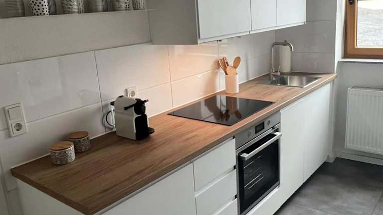 Die Ferienwohnung verfügt über eine voll ausgestattete Küche mit einem Kühlschrank und einer Kaffeemaschine, was es Gästen ermöglicht, eigene Mahlzeiten zuzubereiten.