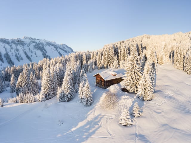 Die Hütte befindet sich auf 1.350m Höhe in Alleinlage, nur 9 km von Oberstdorf und 3,5 km vom Bahnhof in Fischen im Allgäu entfernt.