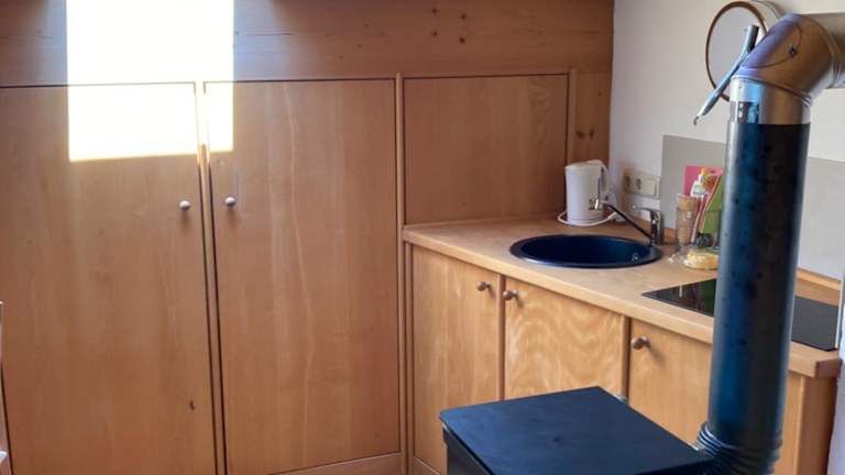 Die Ferienwohnung umfasst ein Schlafzimmer und eine Küchenzeile, die mit einem Kühlschrank, einer Herdplatte und einem Wasserkocher ausgestattet ist. Zur Ausstattung gehören auch Handtücher und Bettwäsche.