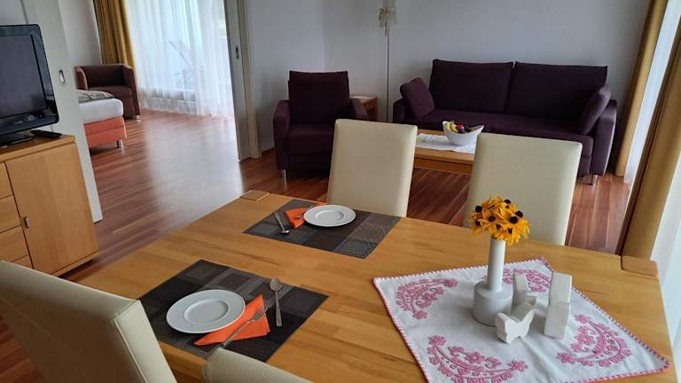 Die Wellness Ferienwohnung mit Bademantelgang zur Therme bietet Ihnen ein komfortables Schlafzimmer, ein Wohnzimmer und eine komplett ausgestattete Küchenzeile. Die Küchenzeile verfügt über einen Kühlschrank und eine Kaffeemaschine, so dass Sie sich bequem selbst versorgen können. Das moderne Badezimmer ist mit einer Dusche und kostenlosen Pflegeprodukten ausgestattet. Handtücher und Bettwäsche werden in der Ferienwohnung gestellt, so dass Sie sich um nichts kümmern müssen.