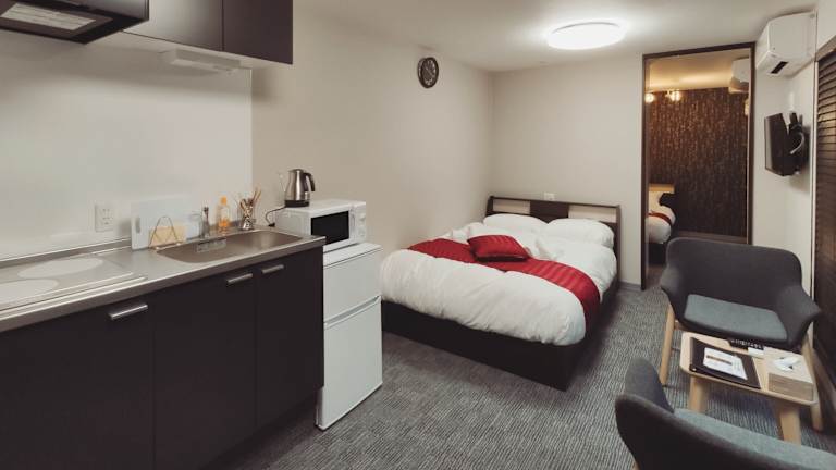 Die Zimmer sind ausgestattet mit Klimaanlage, einem Kühlschrank, einer Mikrowelle, einem Wasserkocher, einem Bidet, einem Haartrockner und einem Schreibtisch. Jedes Zimmer verfügt über ein eigenes Badezimmer, Hausschuhe und Bettwäsche.