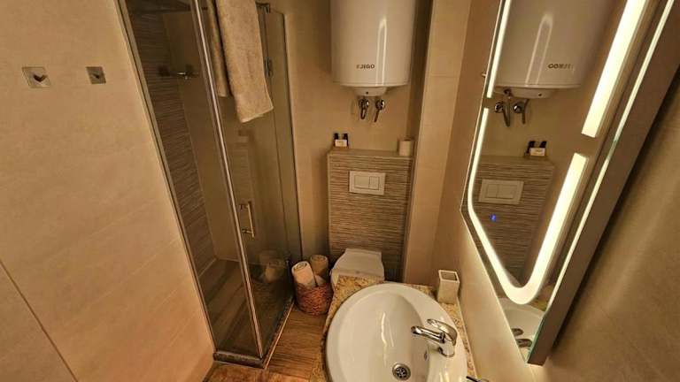 Die Unterkunft befindet sich in Ohrid, nur 1,1 km vom Strand Saraiste und 1,4 km vom Strand Potpesh entfernt. In der Nähe befinden sich auch interessante Orte wie Plaošnik, der Hafen von Ohrid und die Kirche des Heiligen Johannes von Kaneo. Der Flughafen Ohrid liegt 9 km entfernt.