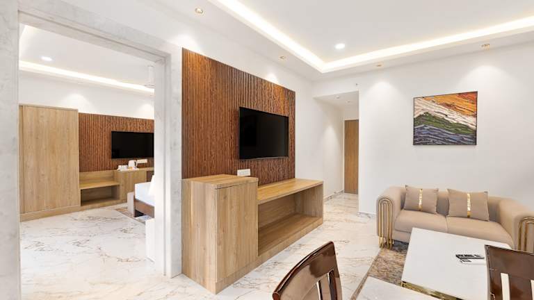 Die klimatisierten Zimmer sind mit einem Schreibtisch, einer Kaffeemaschine, einer Minibar, einem Safe, einem Flachbild-TV und einem eigenen Badezimmer mit Dusche ausgestattet. Viele Zimmer bieten einen Balkon mit Poolblick, ausgewählte Zimmer verfügen über eine Terrasse oder bieten Bergblick. Zur Ausstattung gehören ebenfalls Bettwäsche, Handtücher und ein Wasserkocher.