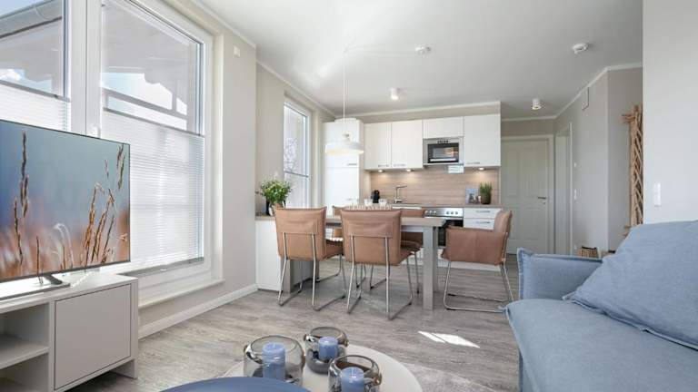 Die Unterkunft verfügt über zwei Schlafzimmer, ein Wohnzimmer und eine gut ausgestattete Küche mit einem Kühlschrank und Geschirrspüler. Weiterhin ist ein TV vorhanden.
