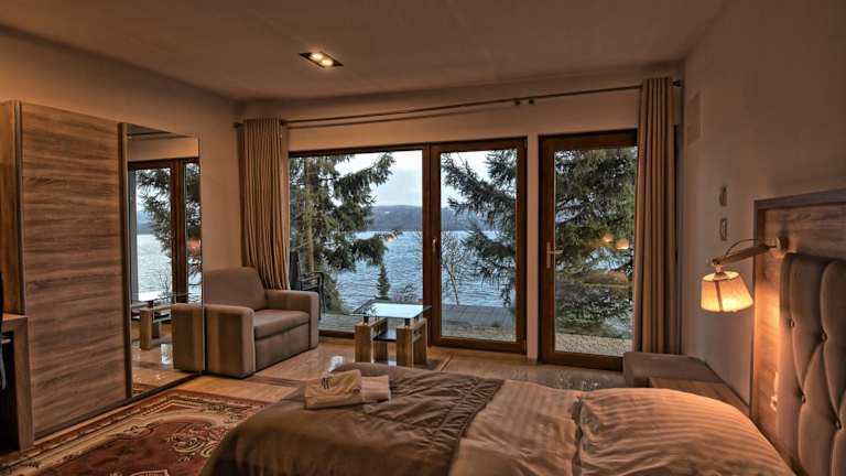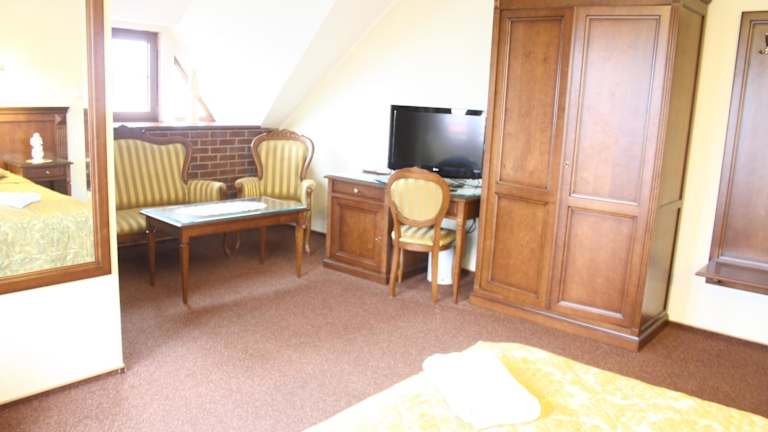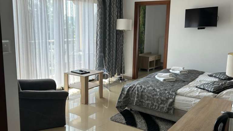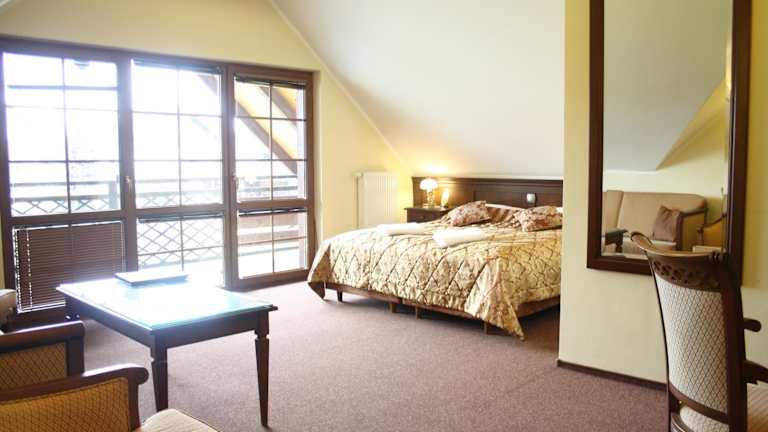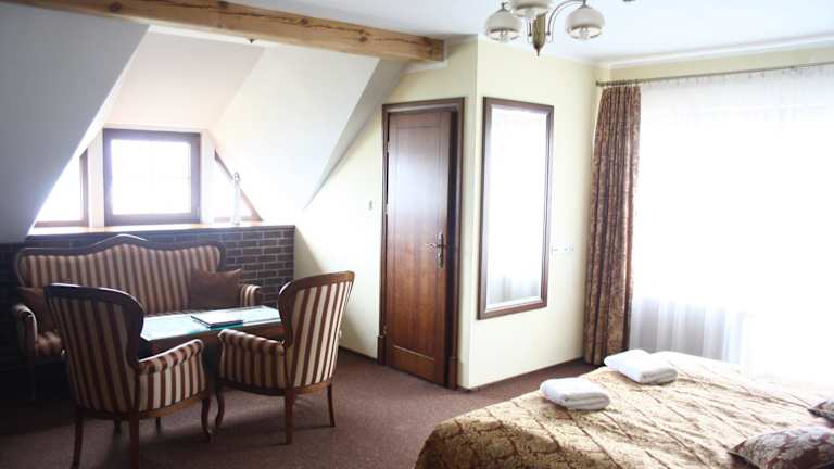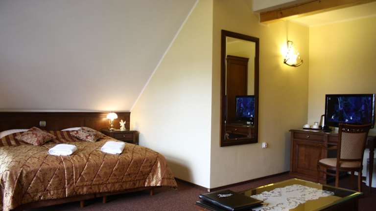 Im Restaurant des Hotels können Sie die polnische Küche genießen. Das Restaurant ist mit Holz- und Steinelementen gestaltet und bietet eine gemütliche Atmosphäre. Jeden Morgen erwartet Sie ein leckeres Frühstücksbuffet, das bereits im Zimmerpreis enthalten ist.