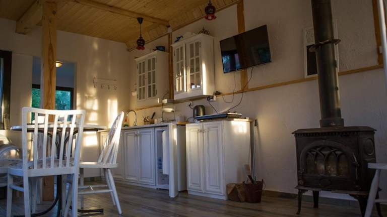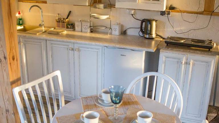Genießen Sie Ihre Mahlzeiten in der eigenen Küchenzeile des Bauernhofs Wiejski Dom, die mit einem Kühlschrank und einem Kochfeld ausgestattet ist. Sie haben die Möglichkeit, Ihre eigenen Gerichte zuzubereiten und die authentische ländliche Atmosphäre zu genießen.