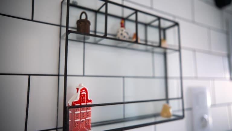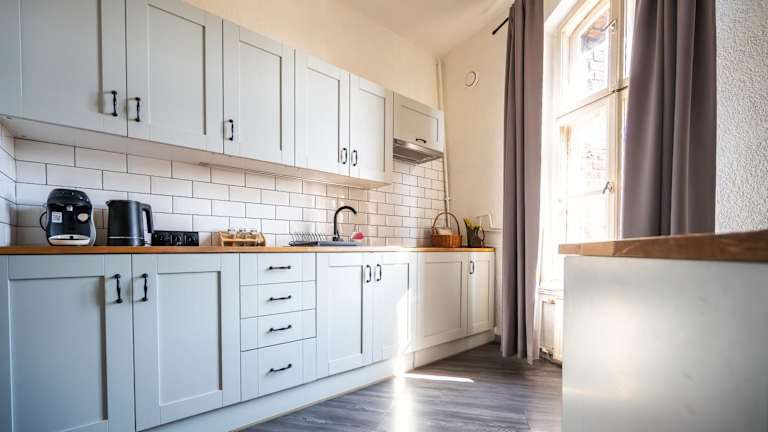 Die Ferienwohnung verfügt über eine voll ausgestattete Küche, die einen Kühlschrank und eine Kaffeemaschine umfasst.