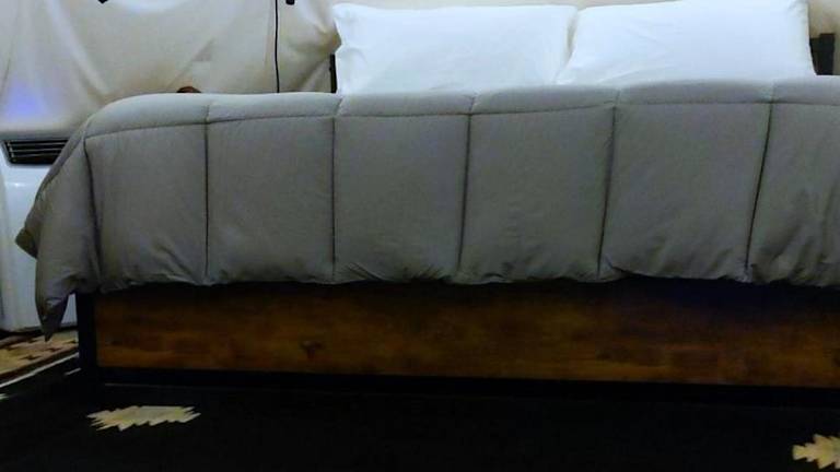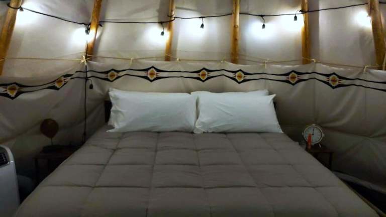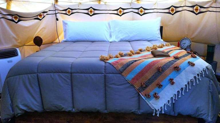 Die Zelt-Lodge verfügt über ein verstellbares King-Bett. Handtücher und Bettwäsche werden bereitgestellt.