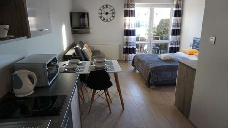Die Wohneinheiten in der Willa Klif sind mit Parkettböden ausgestattet und umfassen eine voll ausgestattete Küchenzeile mit Kühlschrank, Mikrowelle, Herdplatte und Wasserkocher. Ein Essbereich und ein TV sind ebenfalls vorhanden, ebenso ein eigenes Badezimmer mit Dusche.