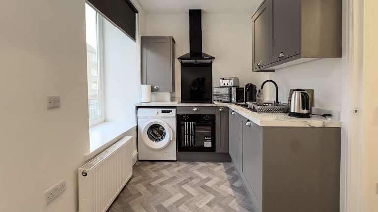 Die Ferienwohnung umfasst ein Schlafzimmer sowie ein Wohnzimmer, das mit einem Flachbild-TV ausgestattet ist. Des Weiteren gibt es eine voll ausgestattete Küche, die den Gästen die Möglichkeit bietet, eigene Mahlzeiten zuzubereiten.