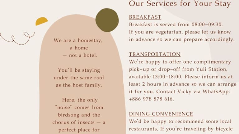 Das Wisdom Garden Home Stay befindet sich in Yuli und ist etwa 22 km vom Bahnhof Ruisui entfernt. Die Unterkunft liegt auch nur 31 km vom Erholungsgebiet Fuyuan National Forest Recreation Area entfernt. In der Nähe finden Sie den Bahnhof Chishang, der etwa 34 km entfernt ist, sowie den Danongdafu Forest Park, der nach einer 35 km langen Fahrt erreicht werden kann. Der nächstgelegene Flughafen, der Flughafen Taitung, ist etwa 83 km entfernt.