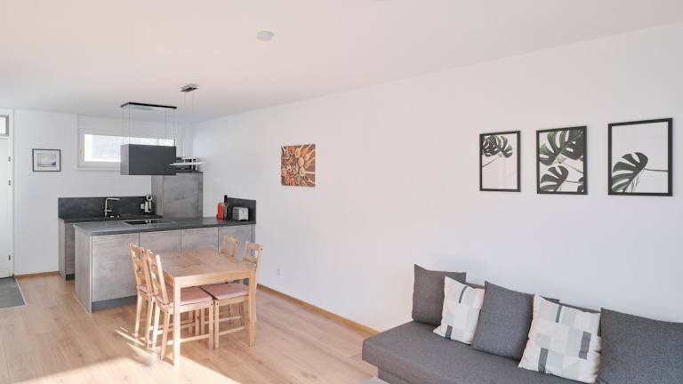 Die Ferienwohnung verfügt über ein Schlafzimmer, ein Wohnzimmer und ein Badezimmer mit Dusche. Zur Ausstattung gehören ein Flachbild-TV, eine gut ausgestattete Küche mit Kühlschrank und Geschirrspüler sowie Handtücher und Bettwäsche. Vor Ort gibt es einen Abstellraum für Skier.
