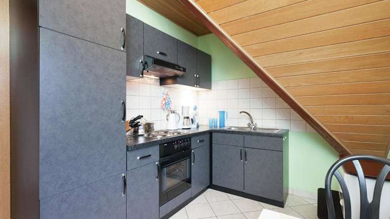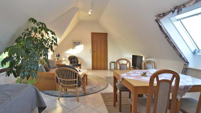 Die Ferienwohnung umfasst ein Wohnzimmer mit Sitz- und Essbereich, eine voll ausgestattete Küche (Kühlschrank, Geschirrspüler, Ofen), ein Schlafzimmer sowie ein Badezimmer mit Dusche und Badewanne. Handtücher und Bettwäsche werden zur Verfügung gestellt.