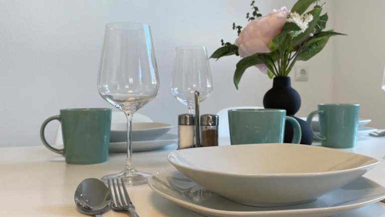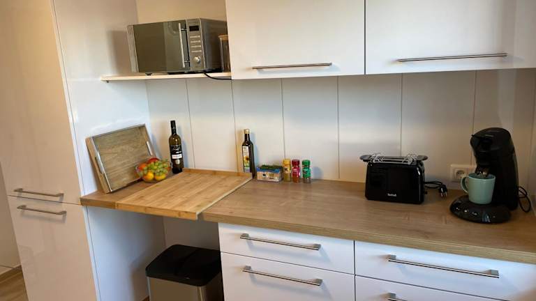 Die Ferienwohnung ist mit einer voll ausgestatteten Küche inklusive Kühlschrank und Kaffeemaschine ausgestattet, was die Zubereitung eigener Mahlzeiten ermöglicht.