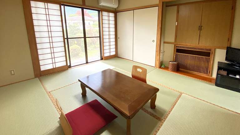 Die klimatisierten Zimmer sind im traditionellen japanischen Stil mit Tatamiböden und Futonbetten eingerichtet. Jedes Zimmer ist mit Teezubehör, einem Kühlschrank und einem angeschlossenen WC ausgestattet. Die Gäste nutzen ein Gemeinschaftsbad und haben die Möglichkeit, ein privates Thermalbad kostenlos zu reservieren.