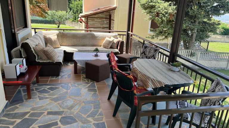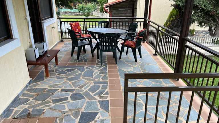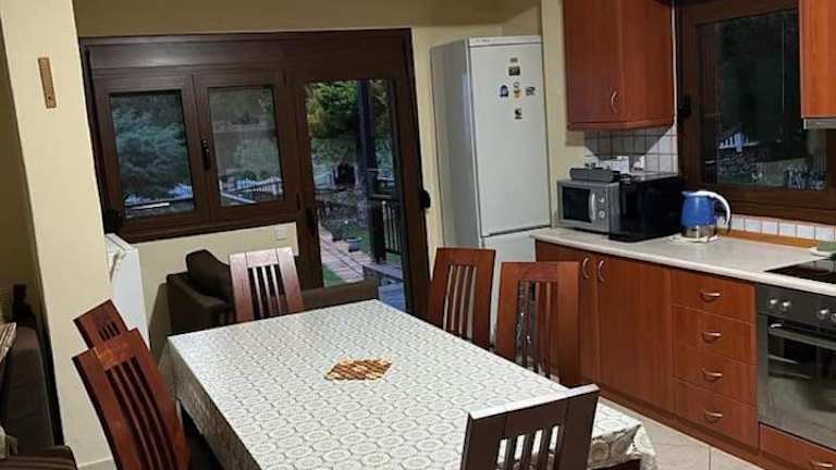 Die Unterkunft besteht aus drei Schlafzimmern und einem Wohnzimmer. Darüber hinaus ist eine voll ausgestattete Küche vorhanden, die unter anderem mit einem Kühlschrank und einem Ofen versehen ist. Handtücher und Bettwäsche werden bereitgestellt. Eine Terrasse ergänzt den Wohnraum und bietet einen Blick auf die Umgebung.