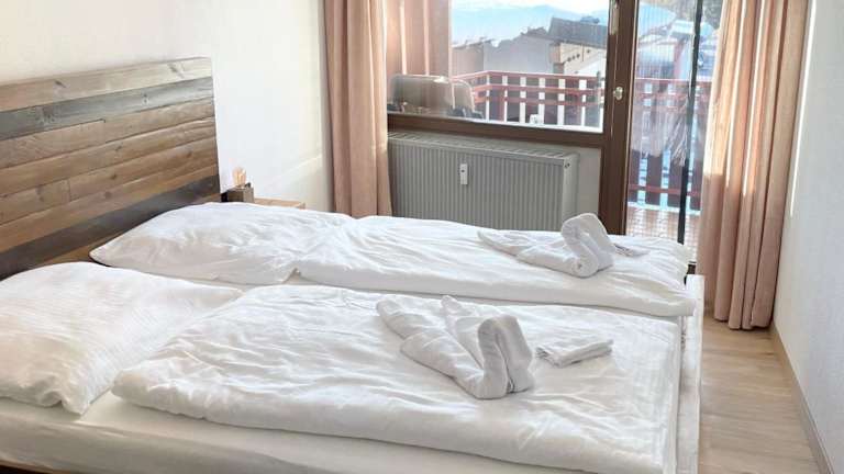 Die Ferienwohnung verfügt über ein Schlafzimmer und ein Wohnzimmer mit Bergblick und ist mit einem Flachbild-TV ausgestattet. Die Küche ist gut ausgestattet und bietet einen Kühlschrank sowie einen Geschirrspüler. Ein Badezimmer mit Badewanne ist ebenfalls vorhanden, und es werden Handtücher sowie Bettwäsche bereitgestellt. Ein Balkon gehört ebenfalls zur Ausstattung der Wohnung.