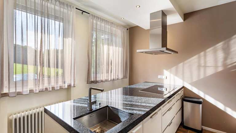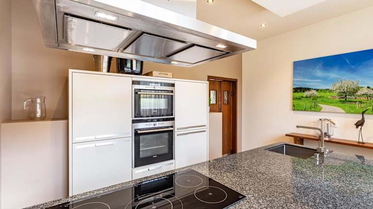 Das Ferienhaus verfügt über eine gut ausgestattete Küche mit Kühlschrank, Geschirrspüler und Ofen, wobei keine spezifischen Verpflegungsoptionen erwähnt werden.