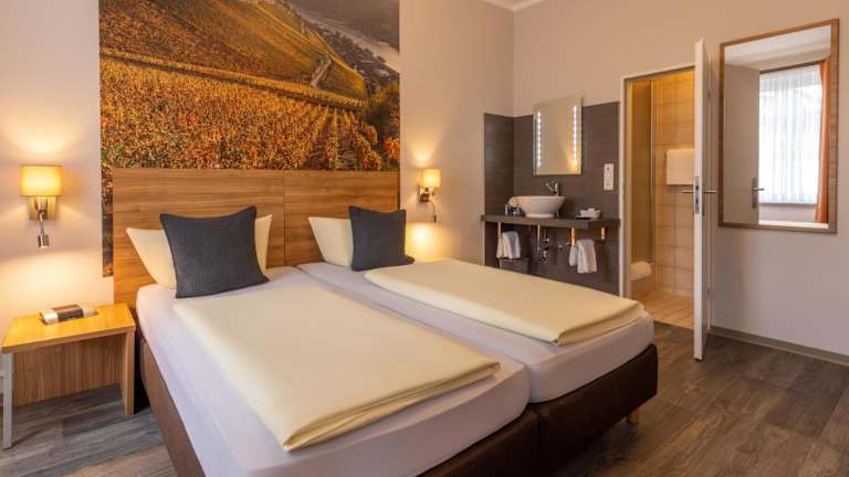 Die Pension Zur Lindenau liegt ruhig in der malerischen Altstadt von Rüdesheim am Rhein, nur 150 m vom Rhein entfernt. Die Unterkunft befindet sich in zwei historischen Gebäuden, die nebeneinander liegen. In unmittelbarer Nähe finden Sie die Gondelbahn von Rüdesheim sowie das beeindruckende Niederwalddenkmal, das nur 3 km entfernt ist. Die Umgebung ist ideal für Aktivitäten wie Radfahren und Wandern. Der Bahnhof Rüdesheim liegt nur 600 m entfernt und die Autobahn A66 erreichen Sie in 20 Fahrminuten.